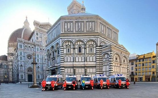 "Tanti auguri di Buona Pasqua da una piazza Duomo deserta come non l'abbiamo mai vista" recita la didascalia della foto che ritrae ambulanze ed operatori davanti al Battistero, alla cattedrale di Santa Maria del Fiore ed al Campanile di Giotto.