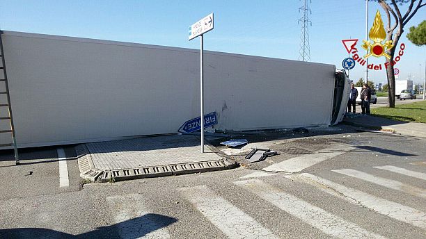 L'incidente è avvenuto nella mattinata in via delle Nazioni Unite a Scandicci. Al vaglio la dinamica della manovra che ha portato il camion a sbilanciarsi.