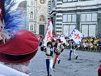 Ed ecco il Corteo storico e gli Sbandieratori intorno alla colonna che si erge dietro al Battistero. Si tratta di una celebrazione non molto conosciuta ma importante per i fiorentini. Si narra infatti che nel 429 in questo giorno, al passaggio delle spoglie del Santo durante la traslazione da San Lorenzo in Santa Reparata, un olmo secco rifiorì dando così origine alla ricorrenza. Esattamente nel punto dove si trova la colonna con la croce in pietra in piazza del Duomo. La croce originale pare fosse stata intarziata con il legno di questo albero. Ed ecco perché una colonna in piazza del Duomo, per ricordare questo miracolo.