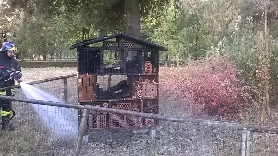 L'hotel degli insetti distrutto dalle fiamme