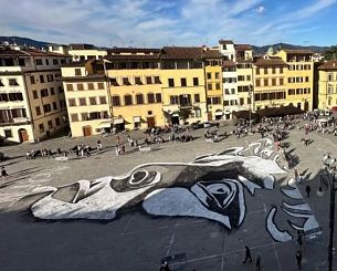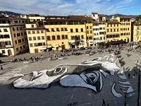 FIRENZE — Rigorosamente in bianco e nero, sul selciato di piazza Santa Croce a Firenze ecco un gigantesco ritratto del David di Michelangelo. L'originale progetto artistico collettivo è stato realizzato da Nonfinito Art Gallery di Tommaso Brogini con l'aiuto di Kumiko Suzuki, insieme agli studenti del liceo artistico Alberti Dante e dell'istituto artistico Porta Romana.