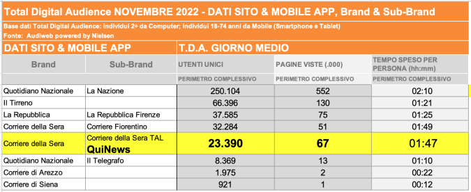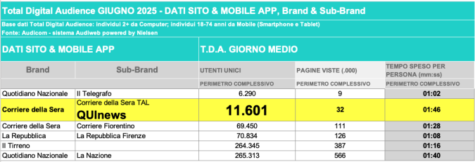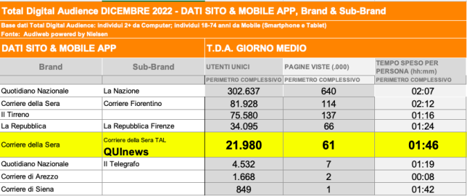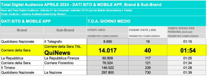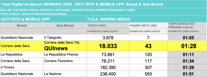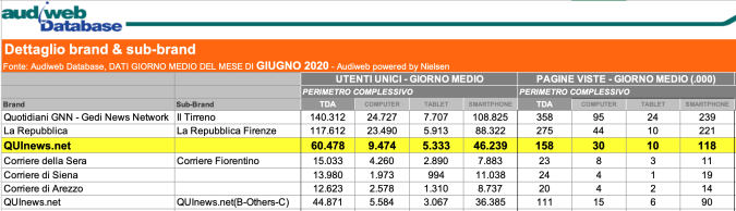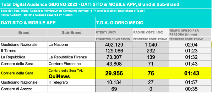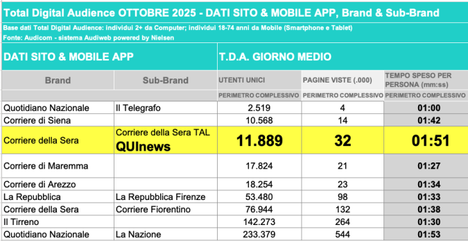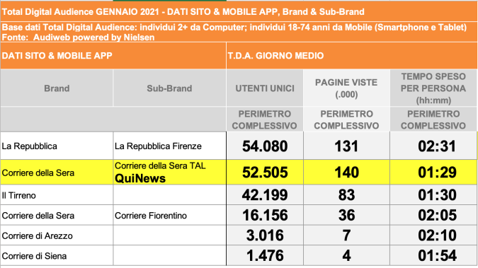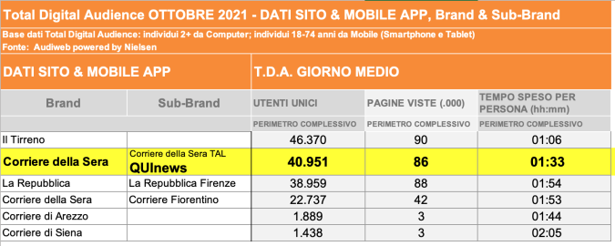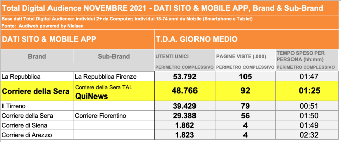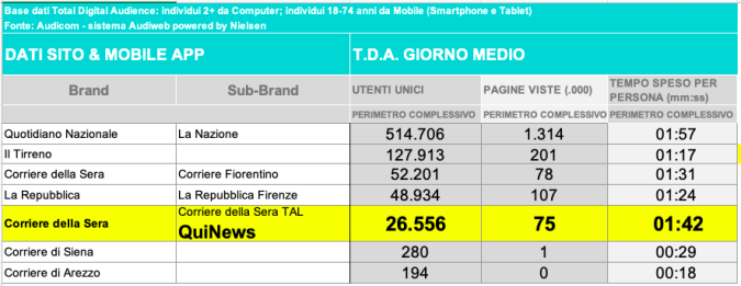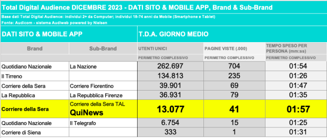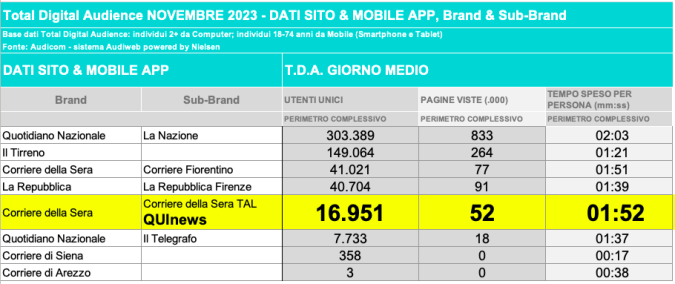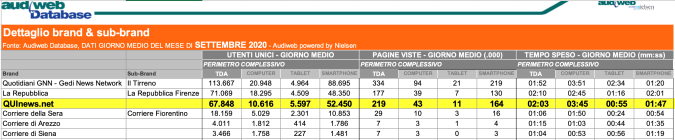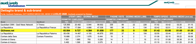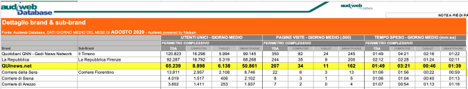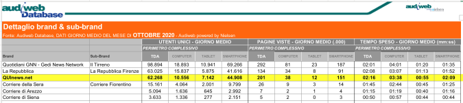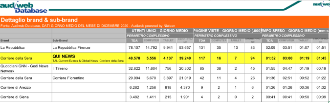 I DATI AUDIWEB DEL MESE DI NOVEMBRE 2020 NON SONO PRESENTI PER ADEGUAMENTO TECNICO DELLA RILEVAZIONE DEL NETWORK QUINEWS COME SUB BRAND DEL CORRIERE DELLA SERA
